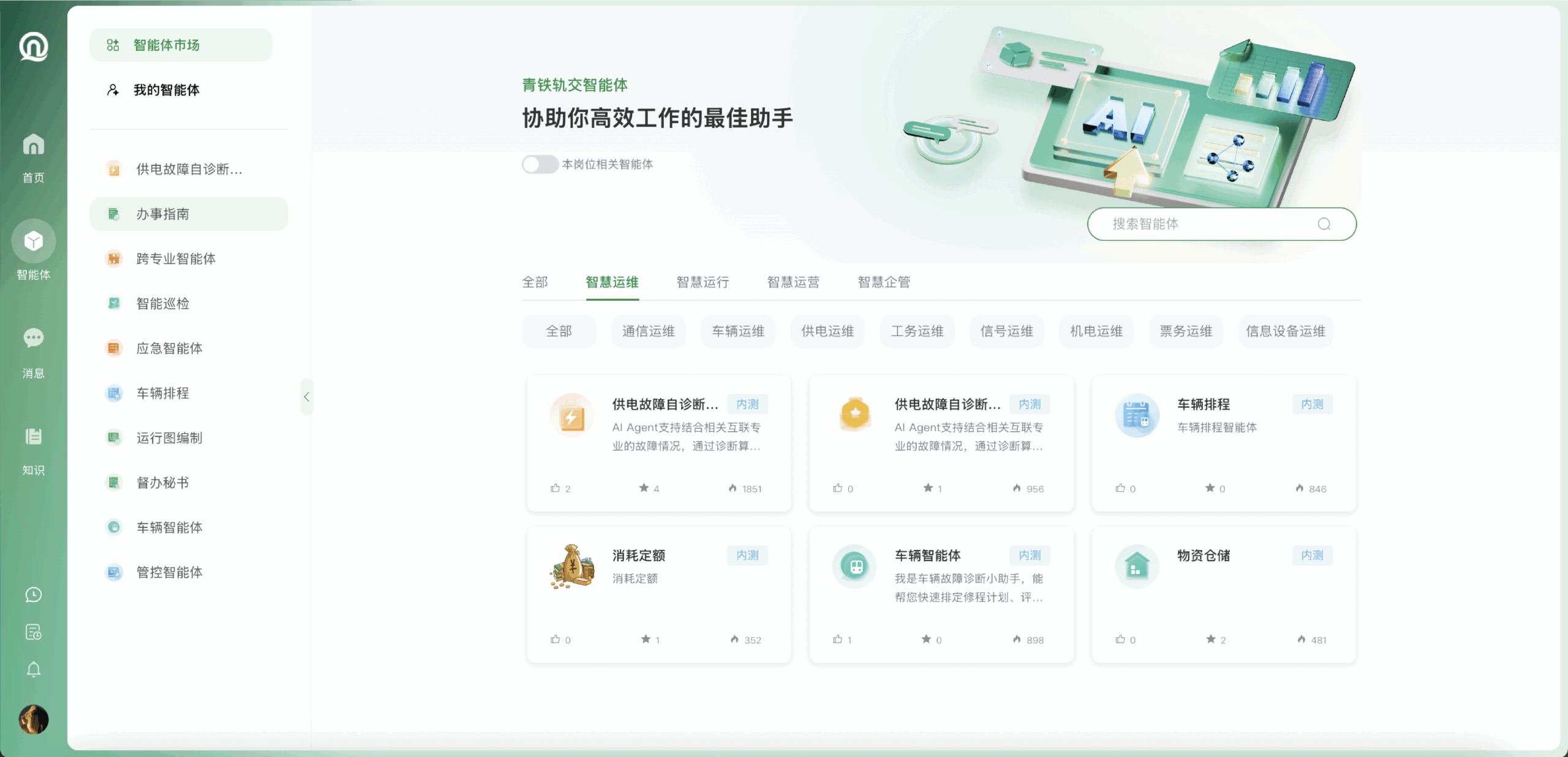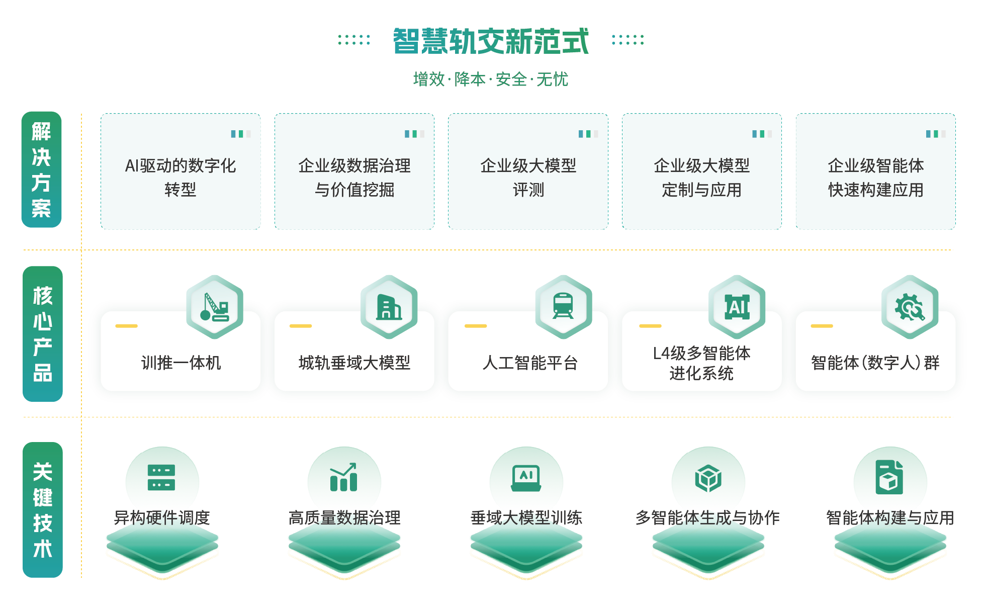 青公司提供涵盖AI驱动的数字化转型、企业级数据治理与价值挖掘、模型评测、垂域大模型定制与应用及智能体构建与应用等多类解决方案,全面覆盖轨道交通运维、运行、建造、企管等全业务场景。通过深度融合大模型与AI技术,我们为城轨企业运营提供端到端的全链路数智化赋能,持续推动城轨行业向更智能、更高效、更现代化的方向演进。